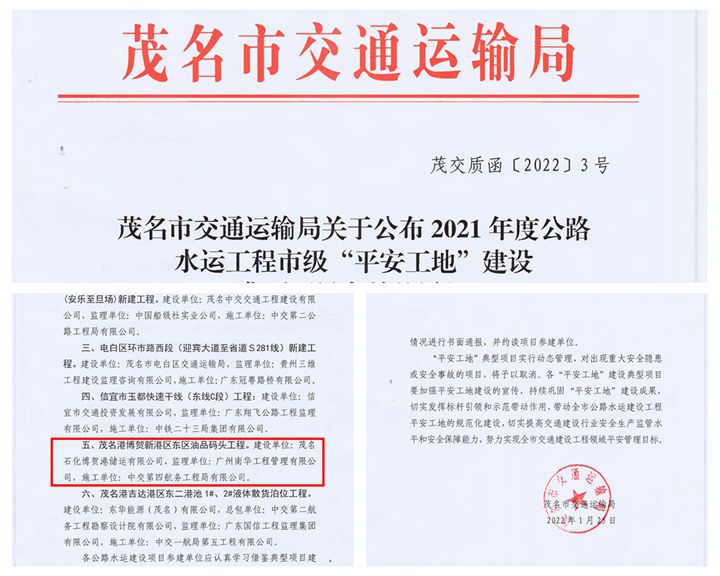 近日,茂名市交通運(yùn)輸局在全市公路水運(yùn)項(xiàng)目中部署開展平安工地建設(shè)考核工作。經(jīng)過層層遴選,茂名港博賀新港區(qū)東區(qū)油品碼頭工程再次被評(píng)為市級(jí)“平安工地”建設(shè)典型項(xiàng)目,連續(xù)兩年榮獲“平安工地”稱號(hào)!