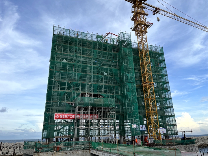 油品碼頭工程2#工作樓為鋼筋混凝土框架結(jié)構(gòu),基礎(chǔ)為澆筑完成的水工平臺,占地面積383.46平方,建筑面積1533.84平方,總高度23.28米,層數(shù)為地上4層,最大層高為7.15米。油品碼頭項目負責(zé)人表示,2#工作樓屬于高支模、大跨度、大荷載模板工程,施工難度大;加之臨水臨邊作業(yè),材料運輸、混凝土澆筑施工存在困難。