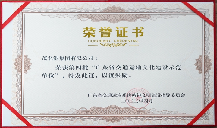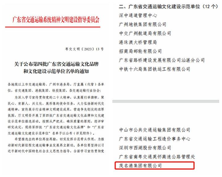 日前,廣東省交通運輸系統(tǒng)精神文明建設指導委員會公布了第四批廣東省交通運輸文化品牌和文化建設示范單位名單,茂名港集團被評為“廣東省交通運輸文化建設示范單位”。