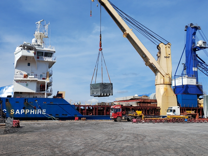 近日,外貿(mào)船舶“藍寶石”輪順利靠泊港口經(jīng)營公司碼頭裝運大型外貿(mào)設備,這是港口經(jīng)營公司今年以來首次靠泊的萬噸級外貿(mào)船舶。