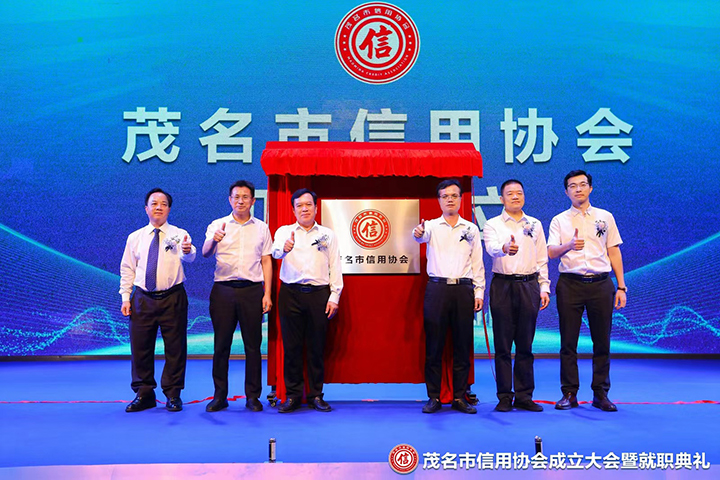 茂名市人大常委會(huì)副主任吳海強(qiáng)(右三),茂名市政協(xié)黨組副書記、副主席楊培基(左三),茂名市人民政府副秘書長(zhǎng)何江(右二),茂名市發(fā)展和改革局黨組書記、局長(zhǎng)朱春保(左二 ),廣東省發(fā)展改革委信用建設(shè)處一級(jí)主任科員譚強(qiáng)杰(右一),茂名市信用協(xié)會(huì)會(huì)長(zhǎng)李文(左一)共同為茂名市信用協(xié)會(huì)揭牌。