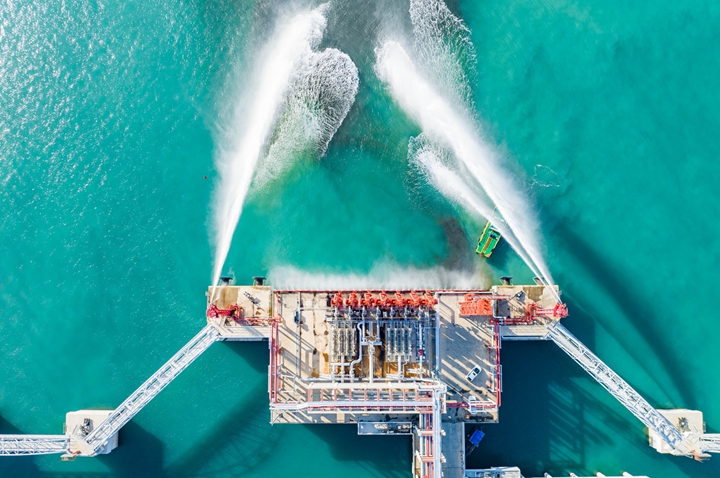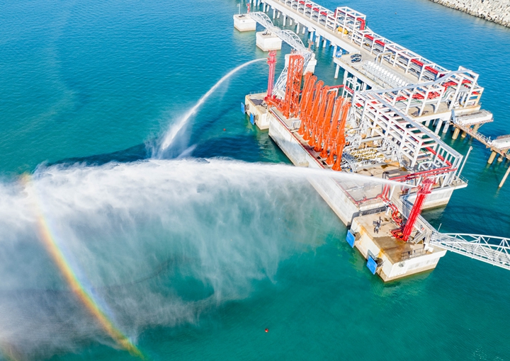 2023年12月7日下午,隨著公用工作樓首層消防泵房的紅色“巨獸”傳出一聲噪響,矗立10萬噸級(jí)成品油泊位兩側(cè)靠船平臺(tái)上的消防炮塔噴射出兩道水柱,標(biāo)志著茂名港博賀新港區(qū)東區(qū)10萬噸級(jí)成品油碼頭項(xiàng)目大型消防泵組和消防炮塔聯(lián)合運(yùn)行成功,為項(xiàng)目即將轉(zhuǎn)入運(yùn)營提供消防安全保障。