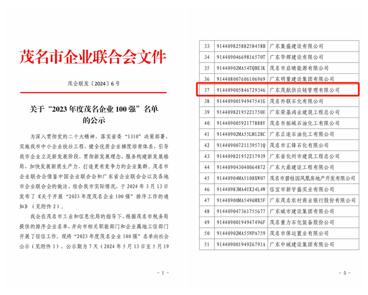 近日,茂名市企業(yè)聯(lián)合會公布了“2023年度茂名企業(yè)100強(qiáng)”名單,茂名港集團(tuán)下屬全資子公司廣東茂航供應(yīng)鏈管理有限公司榮登排行榜第37名,成功跨入2023年茂名百強(qiáng)企業(yè)行列。