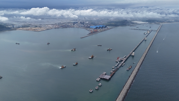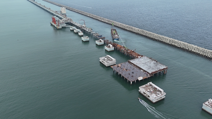 據(jù)悉,30萬(wàn)噸級(jí)原油碼頭設(shè)計(jì)年吞吐量達(dá)1600萬(wàn)噸,泊位長(zhǎng)度達(dá)404米,碼頭共設(shè)計(jì)有145根樁基,由工作平臺(tái)及工作樓平臺(tái)的70根樁基和附屬管廊橋工程的75根樁基組成,其中工作平臺(tái)及工作樓平臺(tái)的70根樁基已于2023年底全部完工。