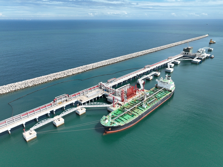 5月29日,利比里亞籍油輪"瓦萊里"號(長183米,寬32米)成功靠泊茂名石化博賀港儲運公司(以下簡稱“石化儲運公司”)10萬噸級成品油碼頭E2泊位,標(biāo)志著該碼頭正式投產(chǎn)運營。此次靠泊的"瓦萊里"號載運3.7萬噸進口石腦油,是碼頭建成后迎來的首艘油輪。