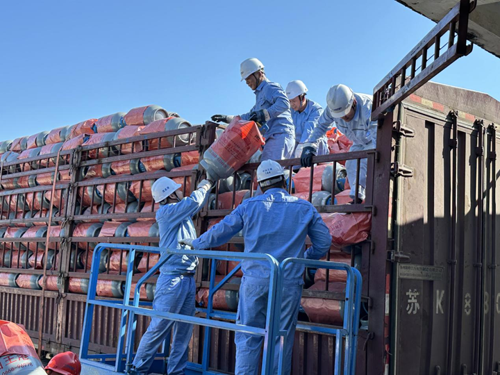 午時剛過,滿載氣瓶的貨車抵達作業(yè)區(qū)域。隨著現(xiàn)場指揮黃思揚一聲令下,干部職工迅速組成攻堅梯隊,形成“卸載—轉(zhuǎn)運—碼放”高效作業(yè)鏈。青年員工陳子豪、鄧卓晶主動承擔(dān)車頂重活,老員工龔波、楊靖發(fā)揮經(jīng)驗優(yōu)勢統(tǒng)籌協(xié)調(diào),全員動作規(guī)范、配合默契,經(jīng)過兩小時連續(xù)奮戰(zhàn),圓滿完成任務(wù)。