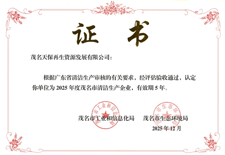 近日,茂名天保再生資源發(fā)展有限公司(以下簡稱“天保公司”)正式確定為茂名市2025年度清潔生產(chǎn)企業(yè),該認定有效期為5年。